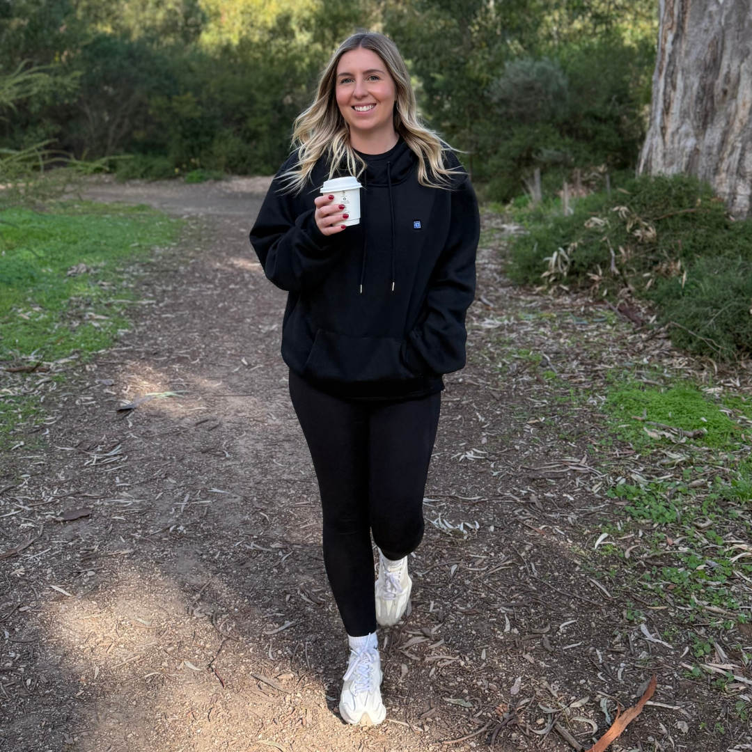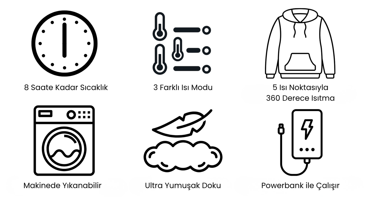 Isıtma sistemi, şarj edilebilir bir batarya (powerbank) ile çalışır; böylece nerede olursanız olun sıcak kalırsınız.